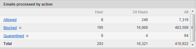 The All column shows us that in a 30 day period, 410k emails came to their addresses, while only 7k were allowed through. The daily chore of checking email has become significantly easier.