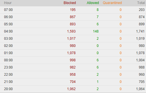 The last column shows the total number of emails received each hour. The red column represents the number of emails strictly blocked by the filter. Green are the allowed emails, while orange shows the number quarantined for review as possible spam. At 8:00pm, 1054 emails came through and only two were legitimate. If these numbers aren’t sobering enough, let’s look at a broader, 30 day period: