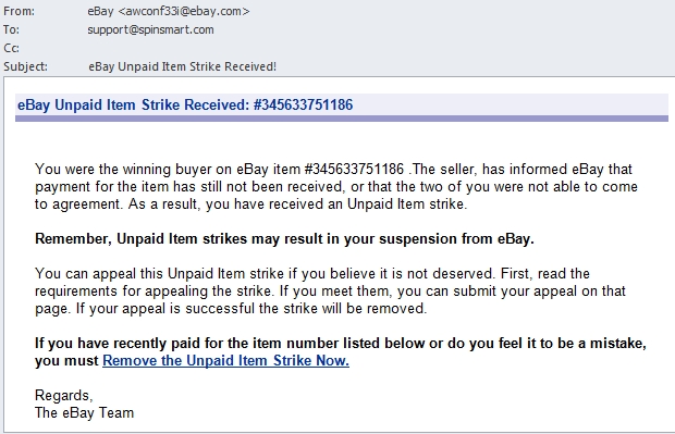 The best bet is to think about it.  I’ve paid for everything on eBay, so why would I get this message?  Close the message, open your browser and pull up eBay yourself to see.  If there’s a problem, it will tell you right away.