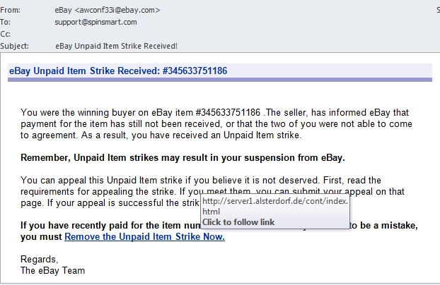 This email plays on eBay users’ fears.  Too many Unpaid Item Strikes and your eBay account could be suspended.  If you click the link, you’ll be taken to what appears to be a standard eBay login page.  Unfortunately, it’s not eBay, and you’ve just given them your user name and password.  Some of the better scammers will redirect you to eBay after you ‘log in’ and you might already be logged in, so you’ll never know the difference.